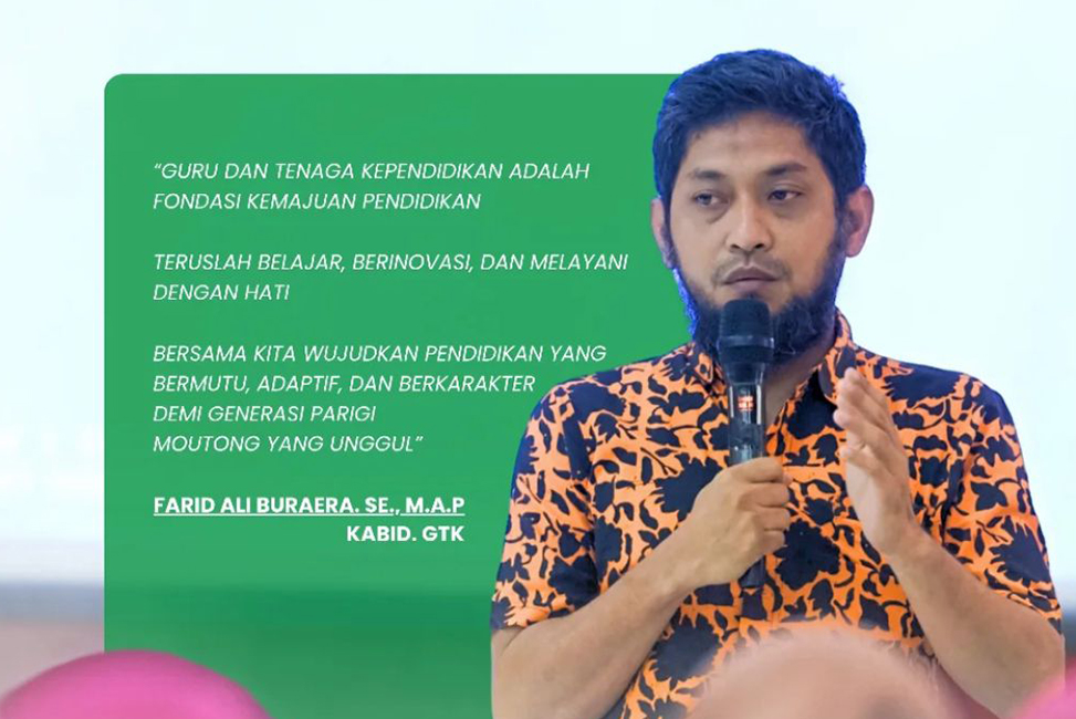 Parigi Moutong, Landasan.id – Kepala Bidang Guru dan Tenaga Kependidikan (GTK) Dinas Pendidikan dan Kebudayaan Kabupaten Parigi Moutong, Farid Ali Buraera, menegaskan bahwa guru memiliki peran krusial sebagai fondasi utama dalam memajukan dunia pendidikan, terutama di tengah tantangan zaman yang terus berubah.